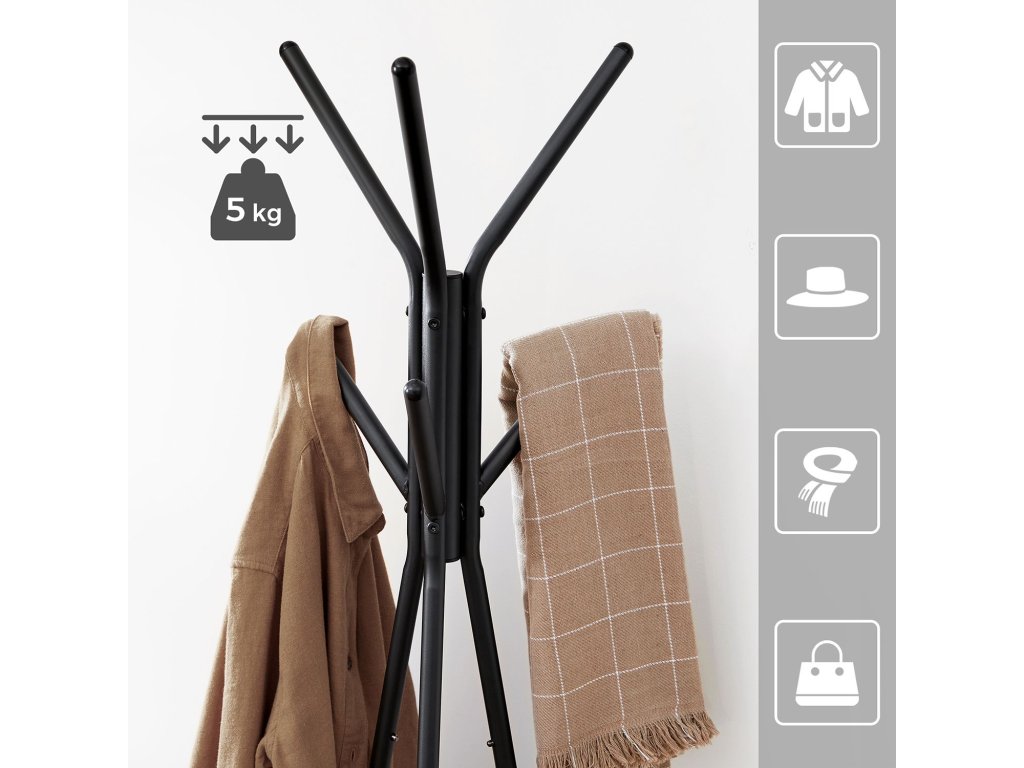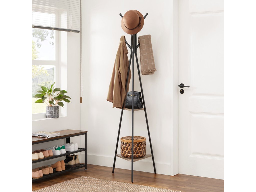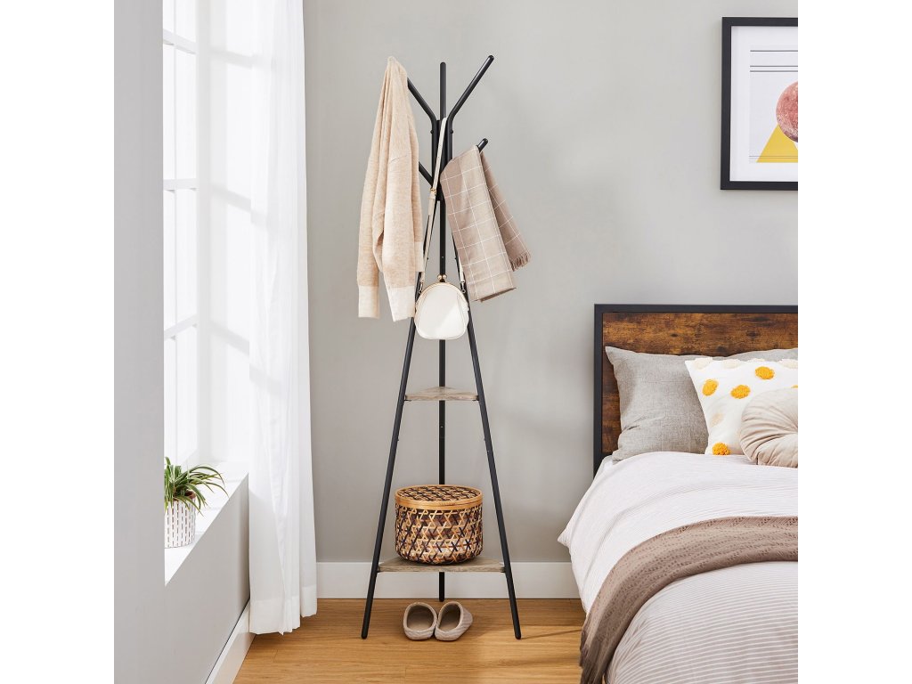 Konstrukce pro dlouhodobé použití: Tento věšák je vyroben z ocelového rámu a silných dřevotřískových desek a vyznačuje se vysokou odolností; má také zaoblené konce háčků, aby se zabránilo promáčknutí nebo poškrábání, a nohy stativu udržují jeho stabilitu;Konstrukce pro extra úložný prostor: Dvě trojúhelníkové police s poutavým béžovým povrchem jsou třešničkou na dortu regálu a zároveň nabízejí další úložný prostor; můžete přidat rostlinu v květináči, která vše oživí;Montáž? Je to hračka! Radost z nového nábytku by neměla být zničena složitou montáží. Proto jsme k němu přiložili přehledný návod a tašku na příslušenství. Za 15-20 minut budete mít tento stojan ve vzpřímené poloze.