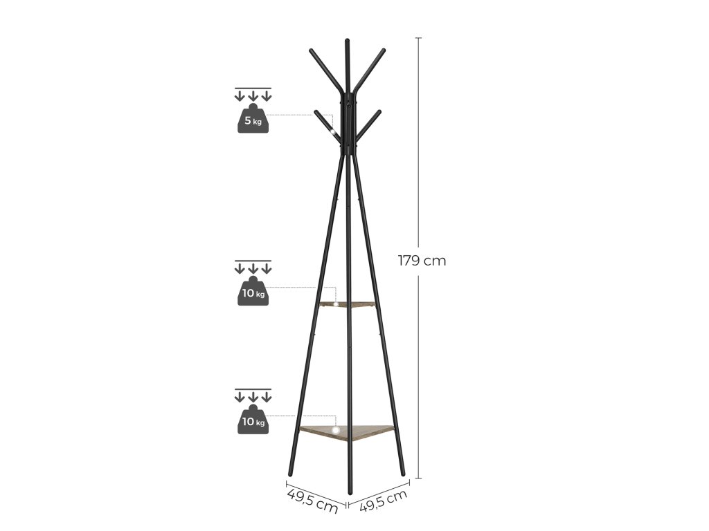 Co získáte: Stojan na kabáty v průmyslovém stylu se 6 hladkými háčky a dvěma trojúhelníkovými úložnými policemi - vytvořte si doma klidný a organizovaný prostor, který bude mít prostor k dýchání.| Kategorie: | Stojany na oblečení |