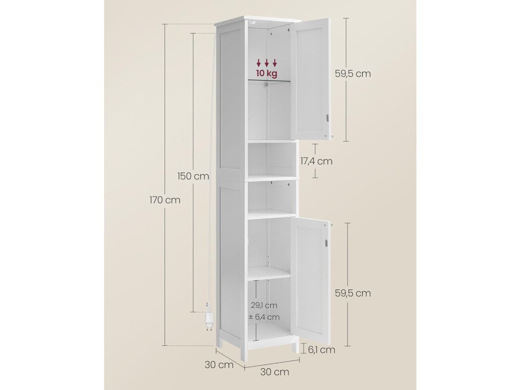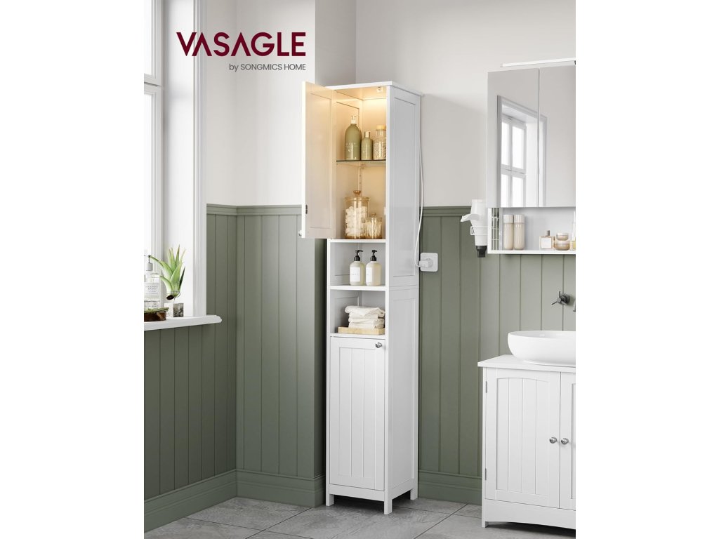 Světlo aktivované dveřmi: Při otevření a zavření dvířek se automaticky rozsvítí a zhasne vestavěné světlo v horní skříňce. Tato konstrukce usnadňuje hledání předmětů ve špatně osvětlených prostorách.2 možnosti montáže: Dveře této koupelnové skříňky lze otevírat doleva nebo doprava, takže se hodí do každé místnosti a poskytuje optimální pohodlí bez ohledu na způsob montáže dveří.VHODNÁ PRO MALÉ PROSTORY - Tato úzká, ale vysoká skříňka s rozměry 30 x 30 x 170 cm (D x Š x V) nabízí dostatek úložného prostoru na malé ploše. je ideální pro malé koupelnové prostory nebo jiné úzké kouty.