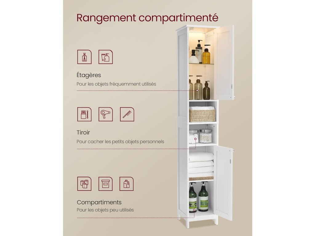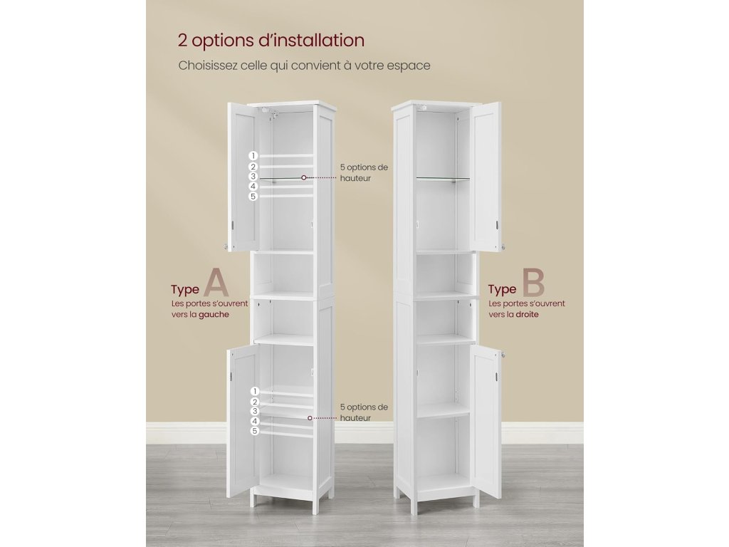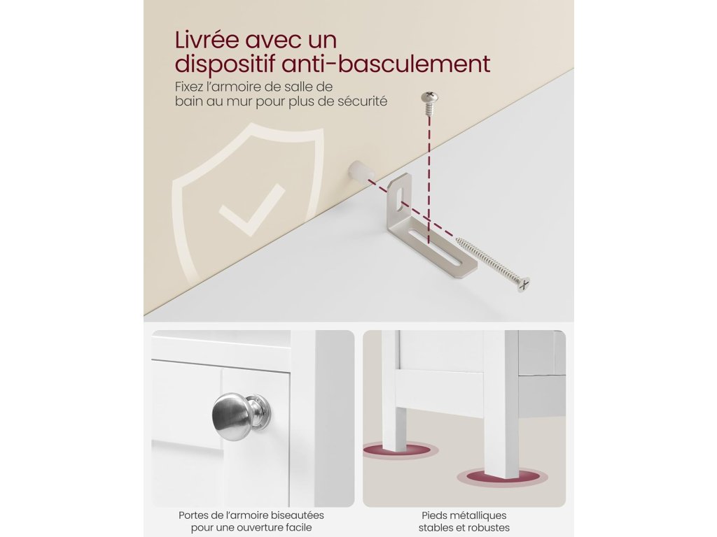 Snadno čistitelná a bezpečná - Tato vysoká koupelnová skříňka je vyrobena z vysoce kvalitní lakované MDF a lze ji snadno čistit. Součástí balení je také ochrana proti překlopení pro bezpečné a stabilní připevnění ke stěně.