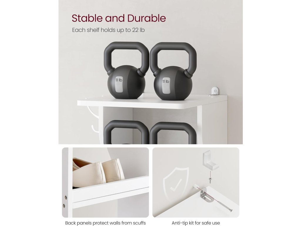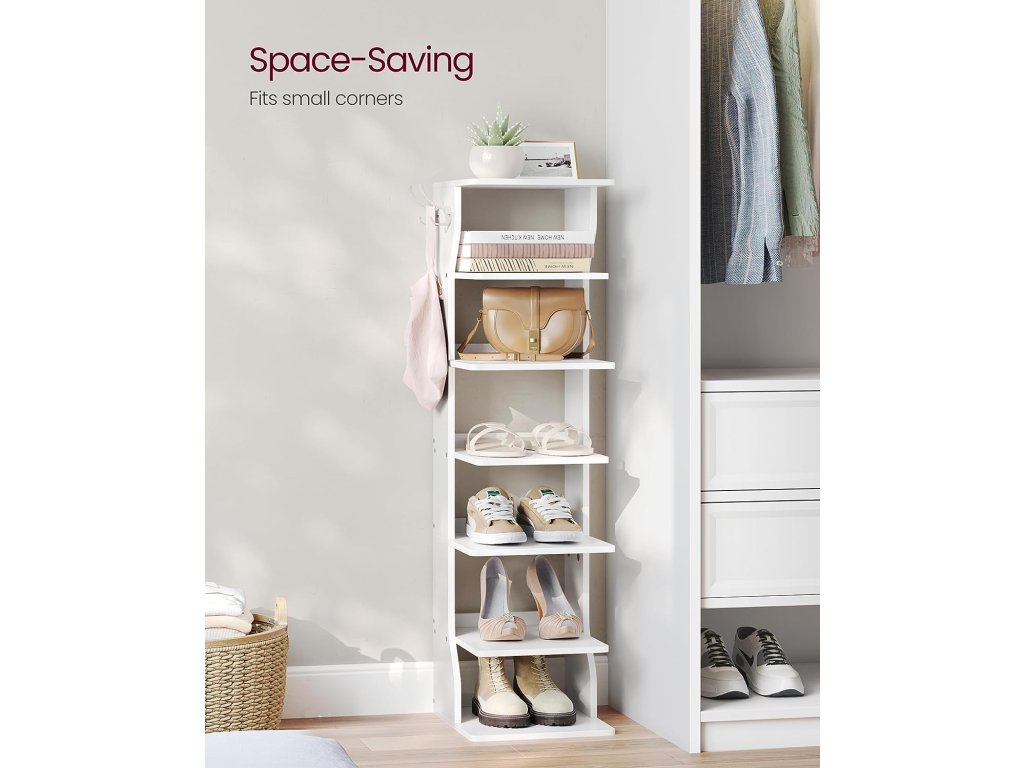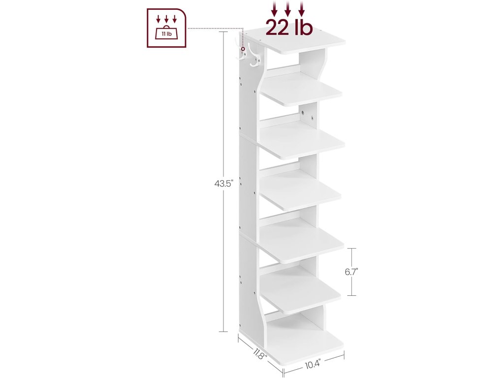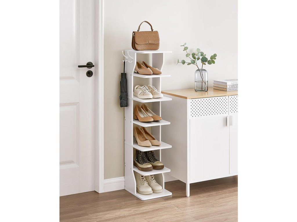 Vejde se do úzkých míst: úložný prostor na boty ve dveřích? Vitríny s drobnostmi nebo rostlinami v úzké chodbě? Všude tam, kde je potřeba úložný prostor tato věž na boty o rozměrech 11,8 "D x 10,4 "Š x 43,5 "V se hodí a přitom nezabere mnoho místa na podlaze.Příslušenství pro zavěšení: Zavěste klíče a peněženky na háčky tohoto rohového stojanu na boty, abyste je mohli během ranního shonu rychle vzít a jít. A co víc, 2 háčky lze nainstalovat vlevo nebo vpravo podle potřeby.Vejdou se do ní i vyšší boty: mokasíny, tenisky, turistické boty, holínky... všechny se dobře vejdou na police s roztečí 6,7 cm mezi jednotlivými botami, ať už jsou vysoké nebo krátké.Nabízí silnou podporu: Tento rohový stojan na boty je vyroben z dřevotřísky a vyznačuje se vysokou pevností (max. zatížení 22 kg na polici), takže se do něj snadno vejdou těžké horolezecké boty.Co získáte: 7úrovňový štíhlý stojan na boty se zadními deskami, které zvyšují stabilitu a chrání stěnu před poškrábáním, a také zařízení proti překlopení, které vám pomůže zajistit věž na boty na stěně pro větší bezpečnost.| Kategorie: | Botníky |