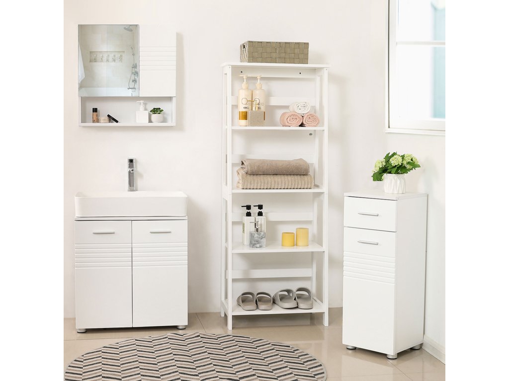 Žebříkový regál, čtyřpatrová knihovna, multifunkční úložný regál do obývacího pokoje, dřevěný stojan do solária, bílý.