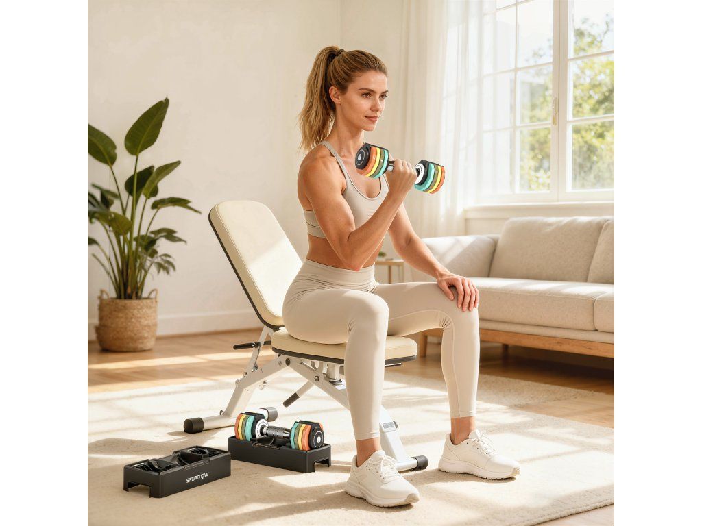 Proměňte své domácí cvičení se sadou činek! Snadno si nastavte hmotnost mezi 1 a 5 kg pomocí otočné rukojeti – ideální pro silový trénink. Zajišťovací systém sady činek zajišťuje stabilitu, zatímco zesílený tác chrání podlahu a udržuje věci v pořádku. Vícebarevný design dodá vaší domácí posilovně barevný nádech!