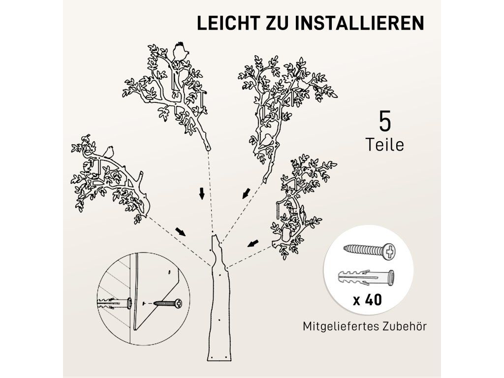 Snadná instalace: Náš věšák na kabáty se dodává v pěti jednotlivých dílech se všemi potřebnými montážními prvky pro montáž na zeď, což vám umožní rychlou a snadnou instalaci a bezpečné připevnění ke zdi.