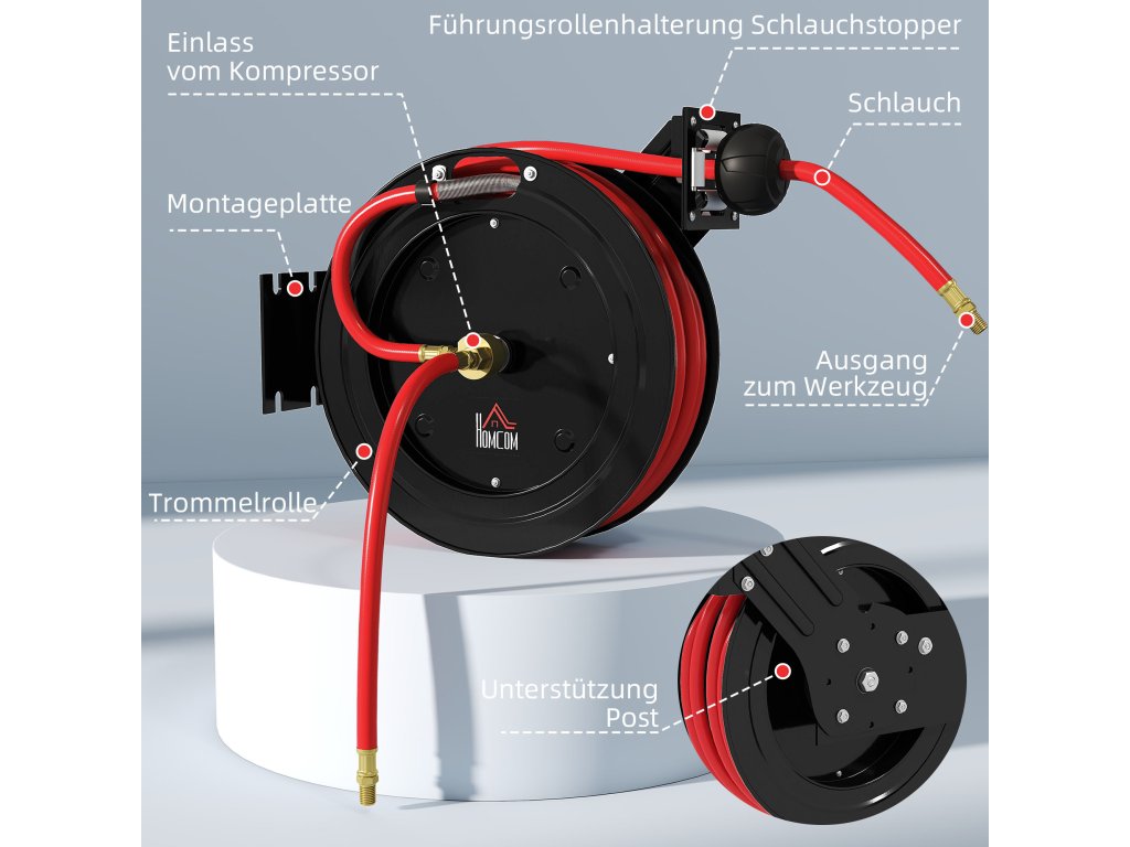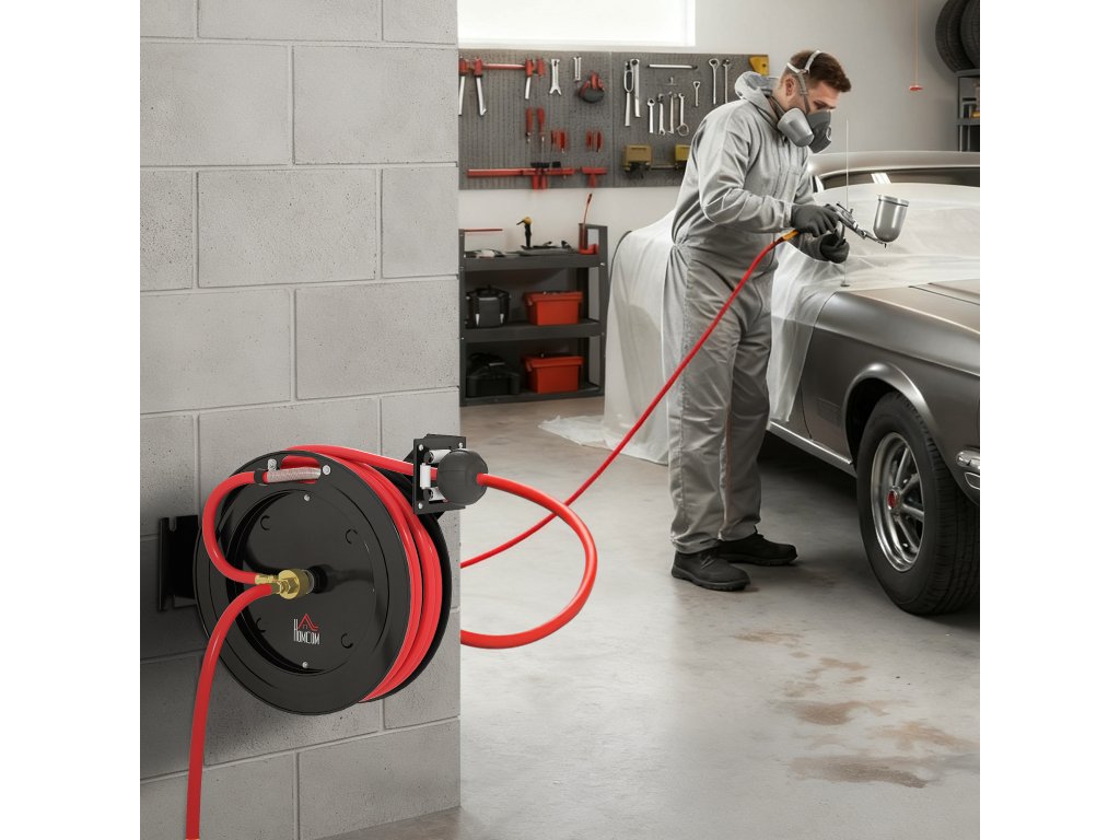 Nástěnná montáž: Tento naviják na hadici je určen k montáži na stěnu, šetří cenný prostor a zajišťuje úhledné uložení hadice. Vytváří bezpečnější a efektivnější pracovní prostor a je vhodný pro autoservisy, dílny, domácí studia a garáže.