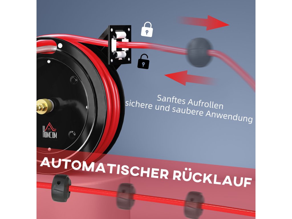 Automatické navíjení pro bezpečnost: Samonavíjecí hadice se jemně navíjí lehkým tahem. Díky tomu zůstávají chodníky volné a bezpečné, ideální pro venkovní aktivity s rodinou. S 15 m dlouhou plastovou hadicí odolnou proti zlomení je zalévání a čištění vždy snadné.