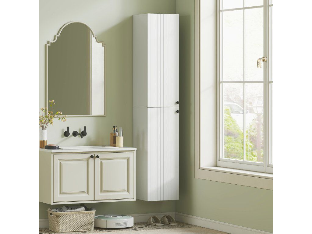 Dostatek úložného prostoru: Dvě skříňky s jedníma dvěma dveřmi, každá se třemi policemi, nabízejí dostatek prostoru na ručníky, toaletní potřeby a každodenní potřeby, takže vše bude uspořádané a snadno dostupné.