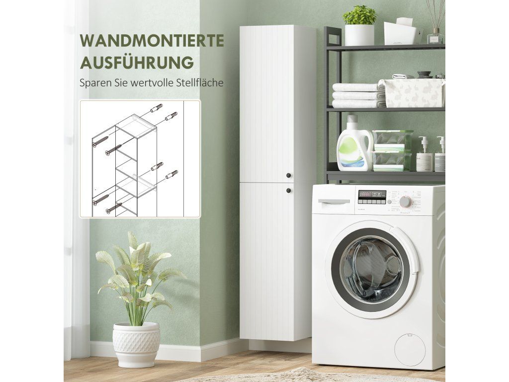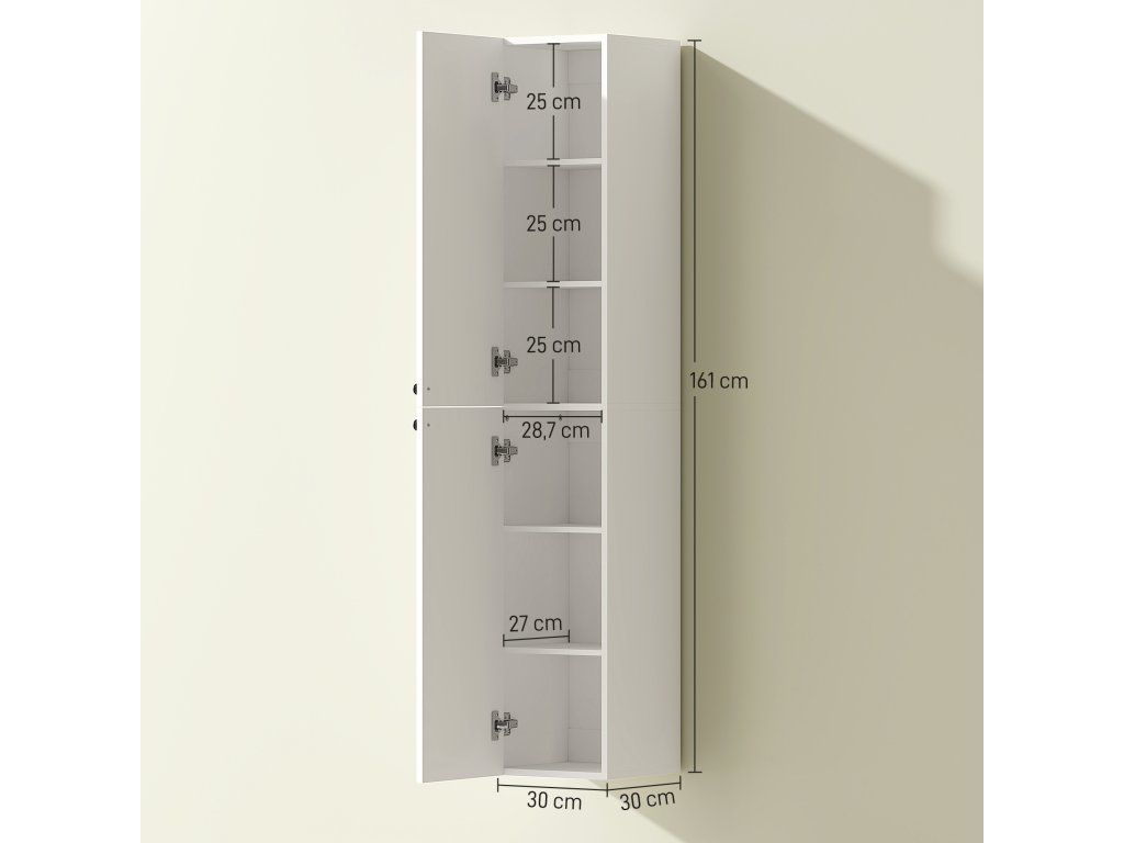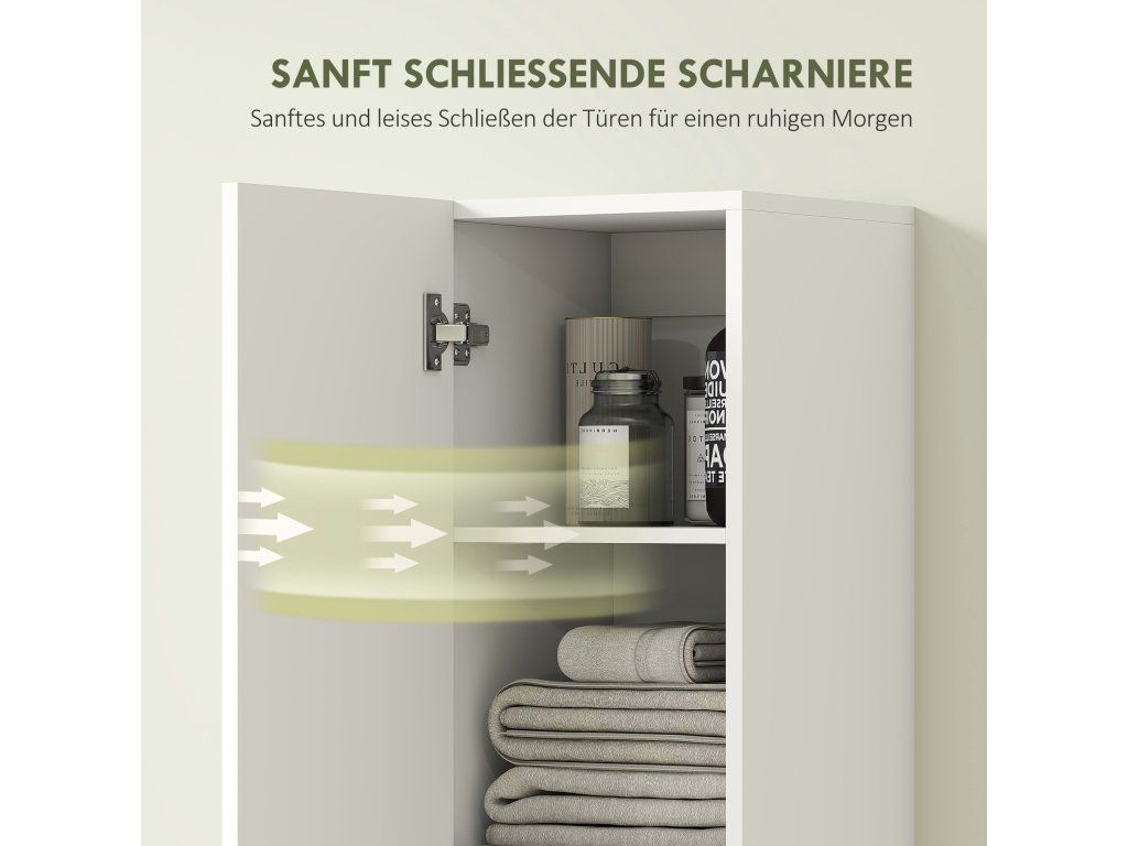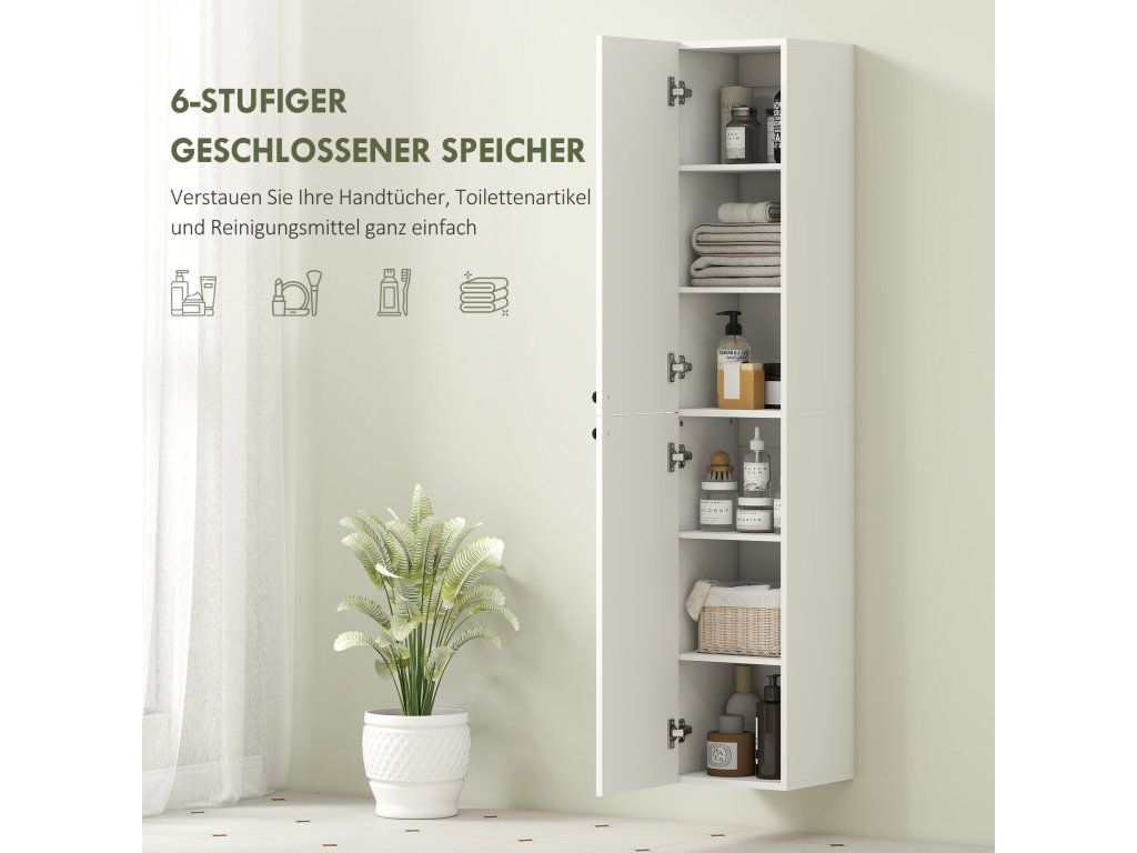 Proměňte svou přeplněnou koupelnu v relaxační oázu s elegantní vysokou skříňkou. Máte omezený prostor? Nástěnný design optimálně využívá vertikální prostor a uvolňuje podlahovou plochu. Díky pantům s tlumeným dovíráním zůstává váš pokoj tichý a dvě skříňky, každá se třemi přihrádkami, pohodlně uloží všechny vaše nezbytnosti. Tato elegantní úložná jednotka, ideální do koupelny nebo kuchyně, kombinuje moderní design s funkčností a obohacuje váš každodenní život.
