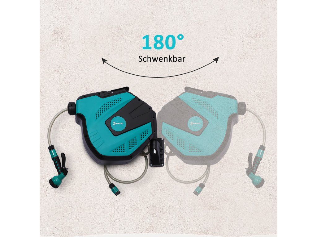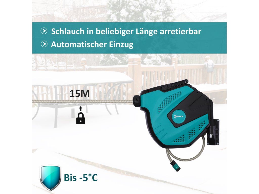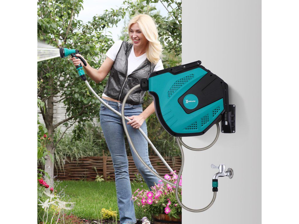 Nástěnný naviják na zahradní hadici je vybaven 15metrovou odolnou hadicí, kterou lze snadno a plynule navíjet i odvíjet. Požadovanou délku si jednoduše přednastavíte a zajistíte pomocí praktické zarážky – bez zamotávání a zbytečného nepořádku. Díky otočnému držáku se naviják přizpůsobí vašemu pohybu a umožní pohodlnou práci v jakémkoli směru, aniž by se hadice kroutila. Integrovaná vícenásobná tryska rozšiřuje možnosti použití – od šetrného zalévání rostlin až po důkladné mytí auta. Spolehlivá ochrana proti mrazu navíc umožňuje používání i při teplotách až do -5 °C.