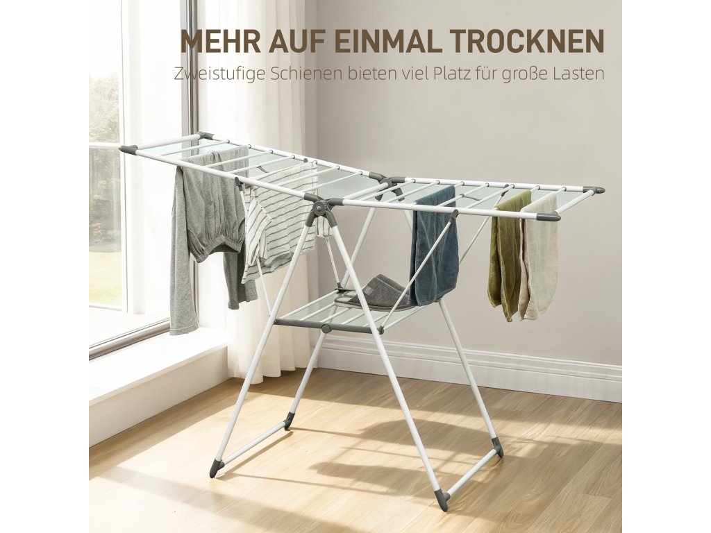 Prostorný sušicí prostor: Tento sušák na prádlo s dvoupatrovými kolejnicemi umožňuje oddělené sušení oblečení a kalhot a nabízí tak dostatek prostoru. Snadno si poradí i s velkým množstvím prádla a udrží váš domov uklizený a organizovaný.