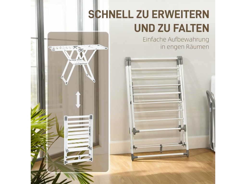 Spolehlivá podpora sušení: Tento sušák na prádlo je vyroben z práškově lakovaného kovového rámu a zajišťuje vynikající stabilitu i při plném naplnění. Unese až 15 kg a je spolehlivým a dlouhodobým řešením pro vaše každodenní potřeby sušení.