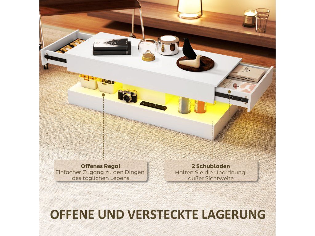 Konferenční stolek se dvěma skrytými zásuvkami vnese do vašeho obývacího pokoje stylový řád. Zářivá LED světla v horní části vytvářejí teplou atmosféru, díky čemuž je odkládací stolek atraktivním ústředním bodem. Otevřená přihrádka ve spodní části umožňuje snadný přístup ke knihám a časopisům.