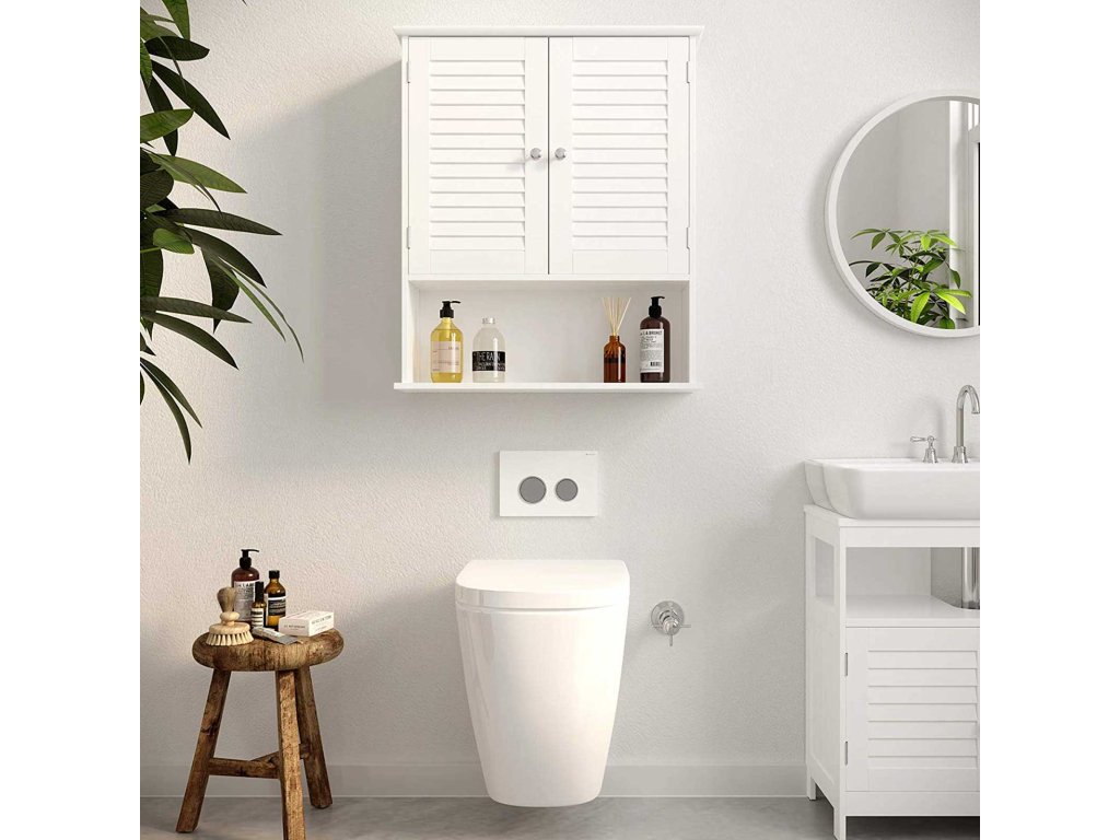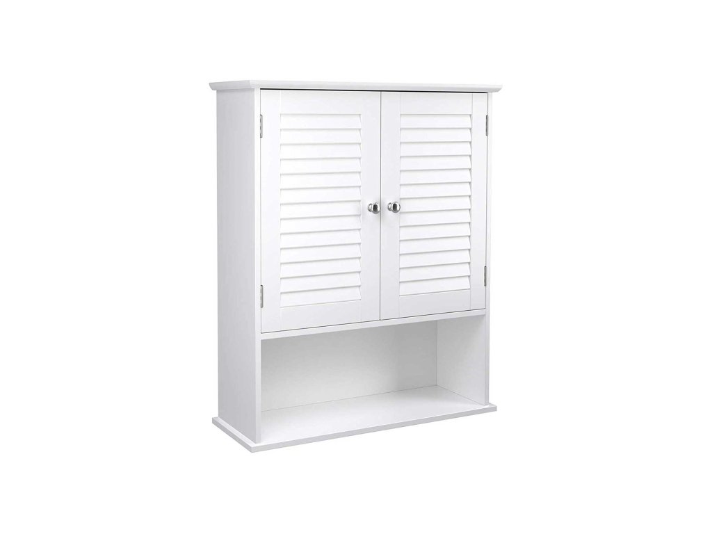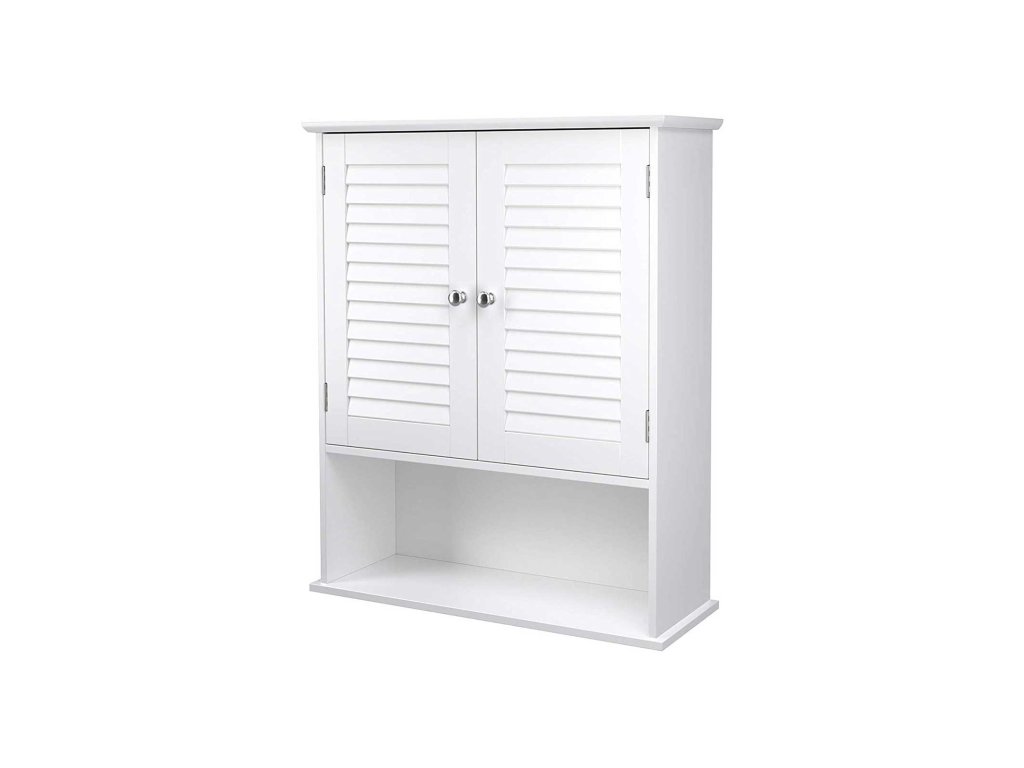 Závěsná koupelnová skříňka, skříňka na léky s nastavitelnou policí, dvojité dveře a otevřená police, 60 x 20 x 70 cm, dřevěná, bílá.