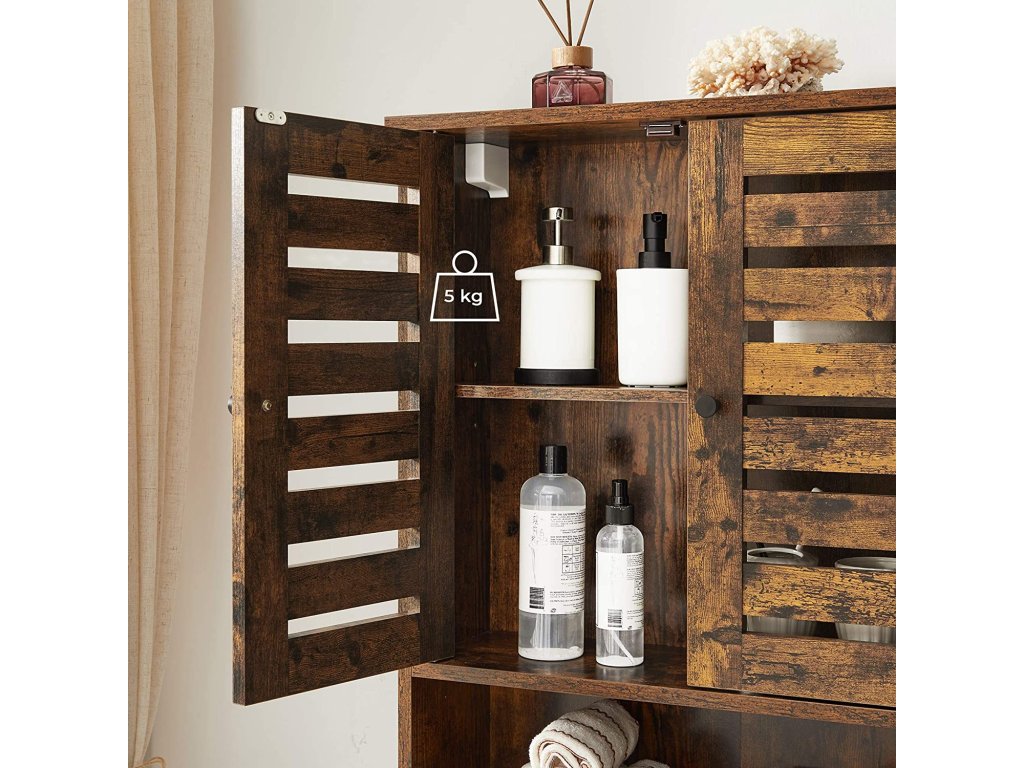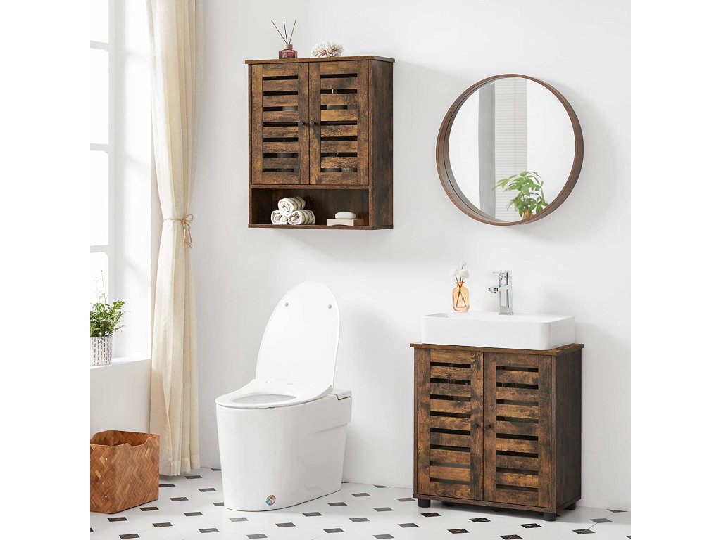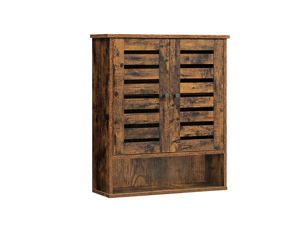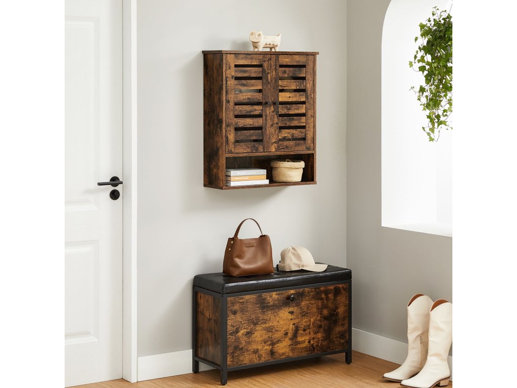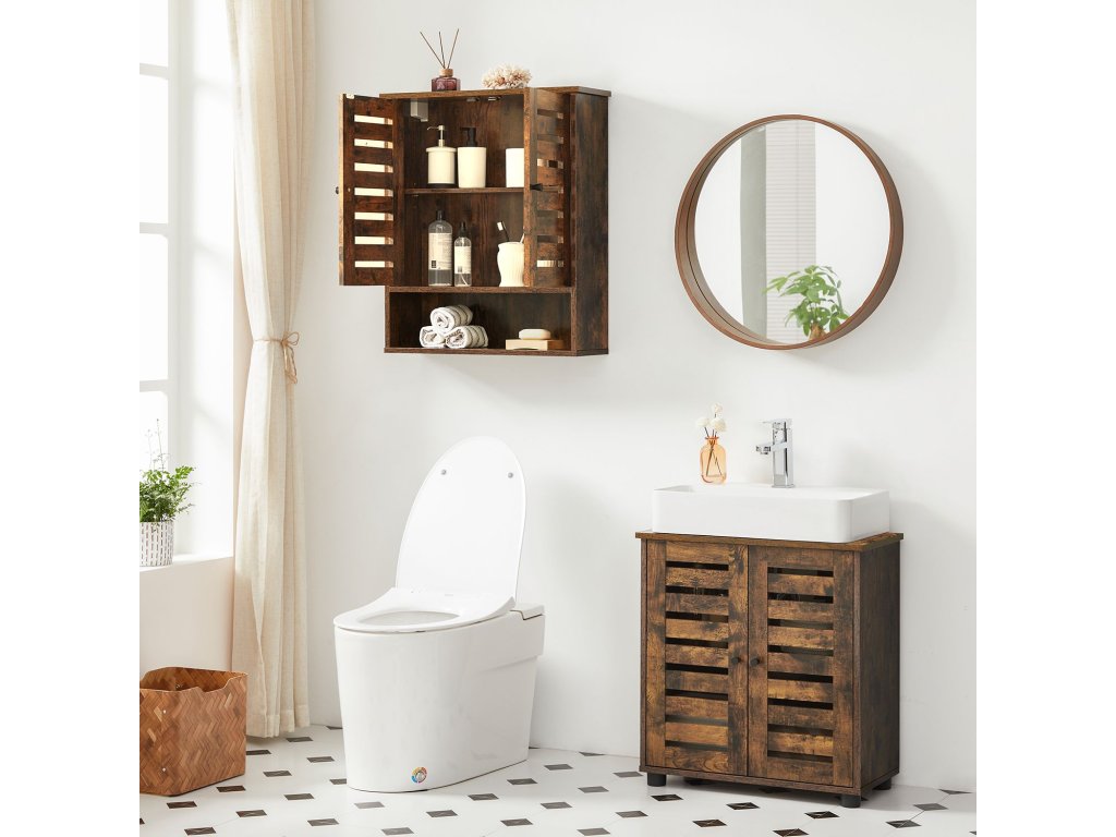 Závěsná koupelnová skříňka, skříňka na léky s nastavitelnou policí, dvojité dveře a otevřená police, 60 x 20 x 70 cm, rustikální hnědá.