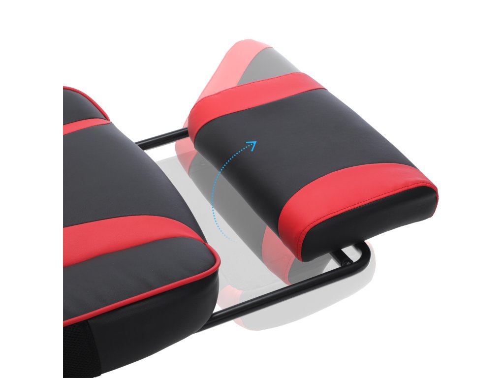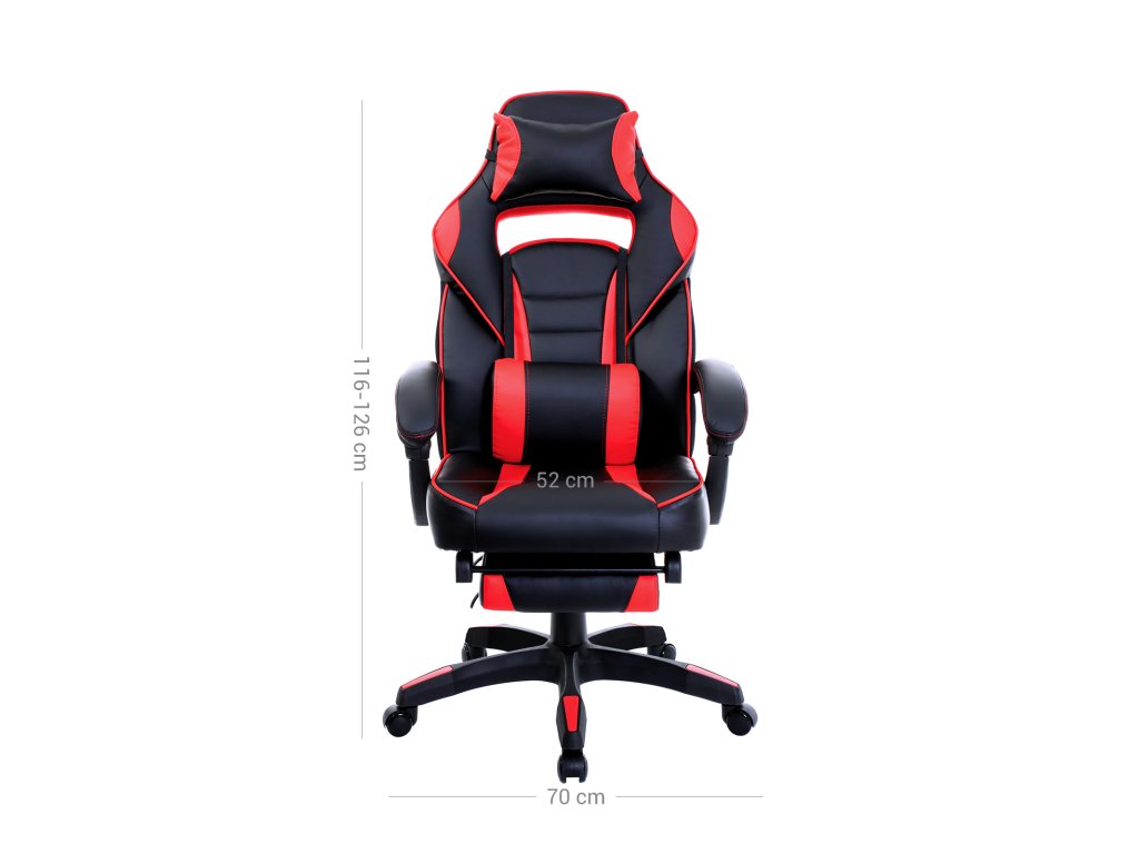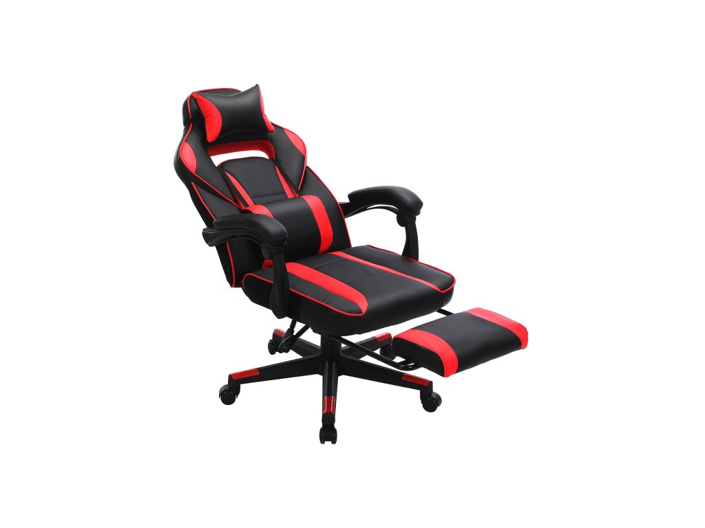 Závodní nastavitelná herní židle s podnožkou, ergonomický design, mechanismus naklápění, opěrka hlavy, bederní opěrka, nosnost 150 kg, černo-červená.