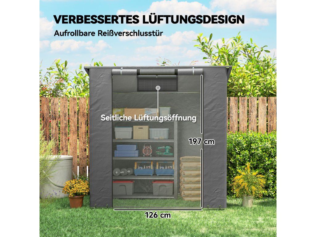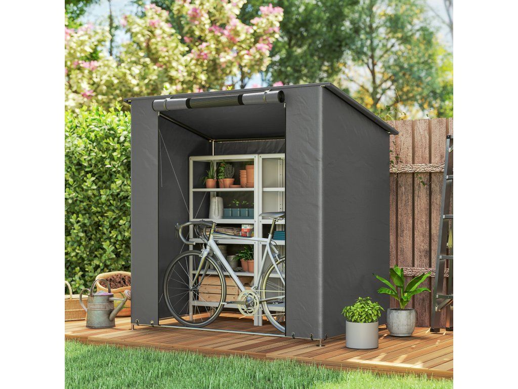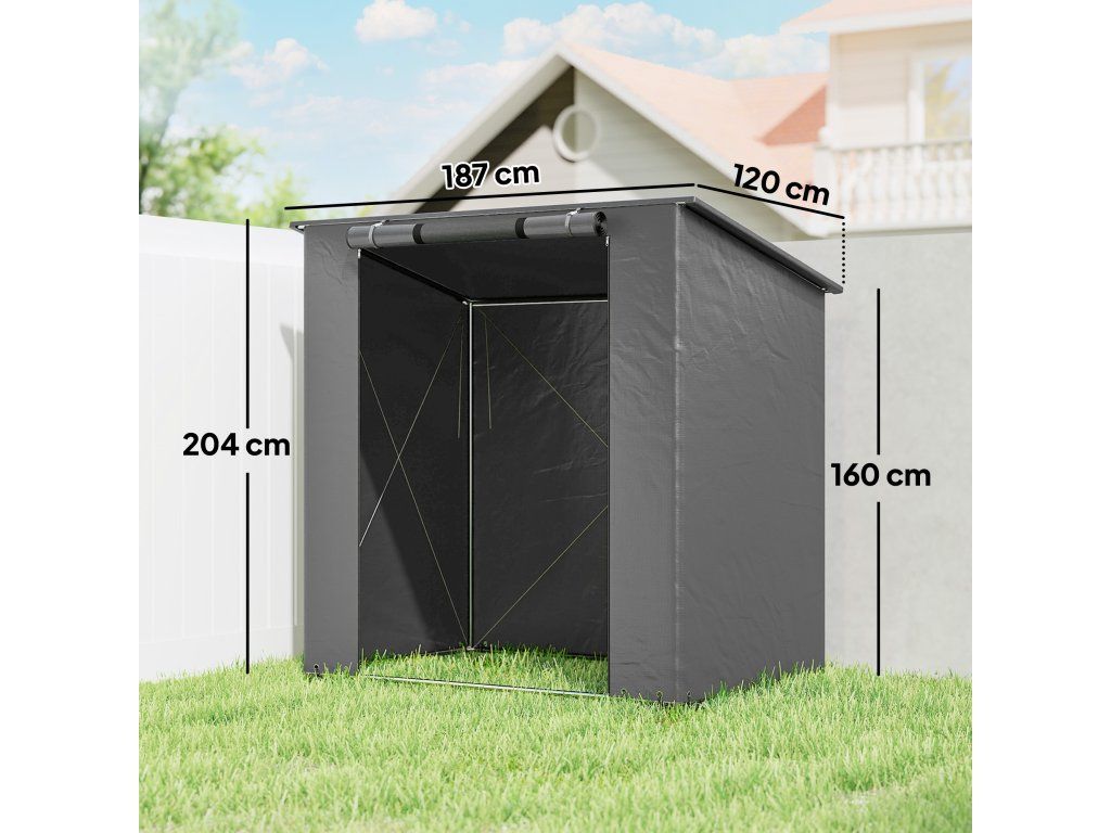 Všestranné úložné prostory: Tento praktický a kompaktní úložný stan s rozlohou přibližně 2,2 m² nabízí dostatek prostoru pro jízdní kola, zahradní nářadí a venkovní vybavení. Ideální pro malé zahrady, terasy nebo příjezdové cesty, kde je prostor omezený.