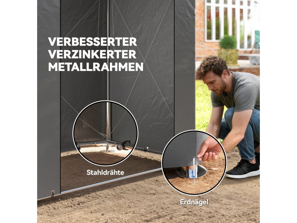 Dvojitě zesílená stabilita: Tato přenosná garážová stan je vyrobena z pozinkovaného ocelového rámu a šesti dalších ocelových lan pro bezpečné uložení vašich kol venku. Nabízí trvalé zabezpečení i za nepředvídatelných povětrnostních podmínek.