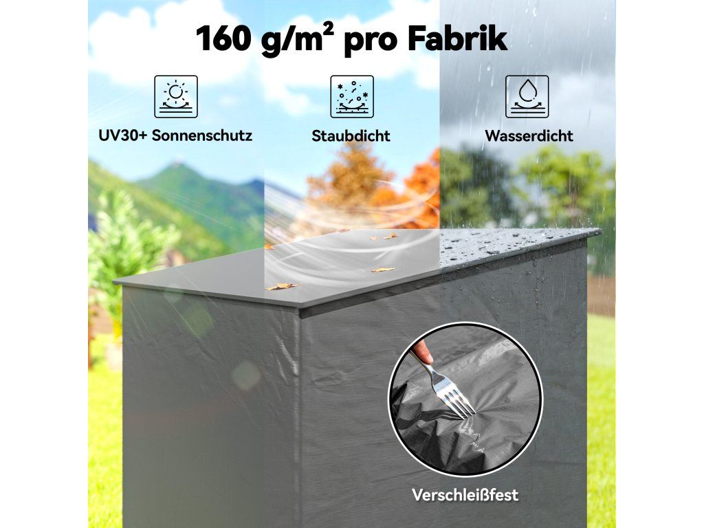 Celoroční ochrana: Odolná PE tkanina 160 g/m² s ochranou UV30+ spolehlivě chrání vaše věci před deštěm, sluncem a vlhkostí. Plošina garážového stanu zajišťuje rychlý odtok vody a udržuje interiér suchý po celý rok.